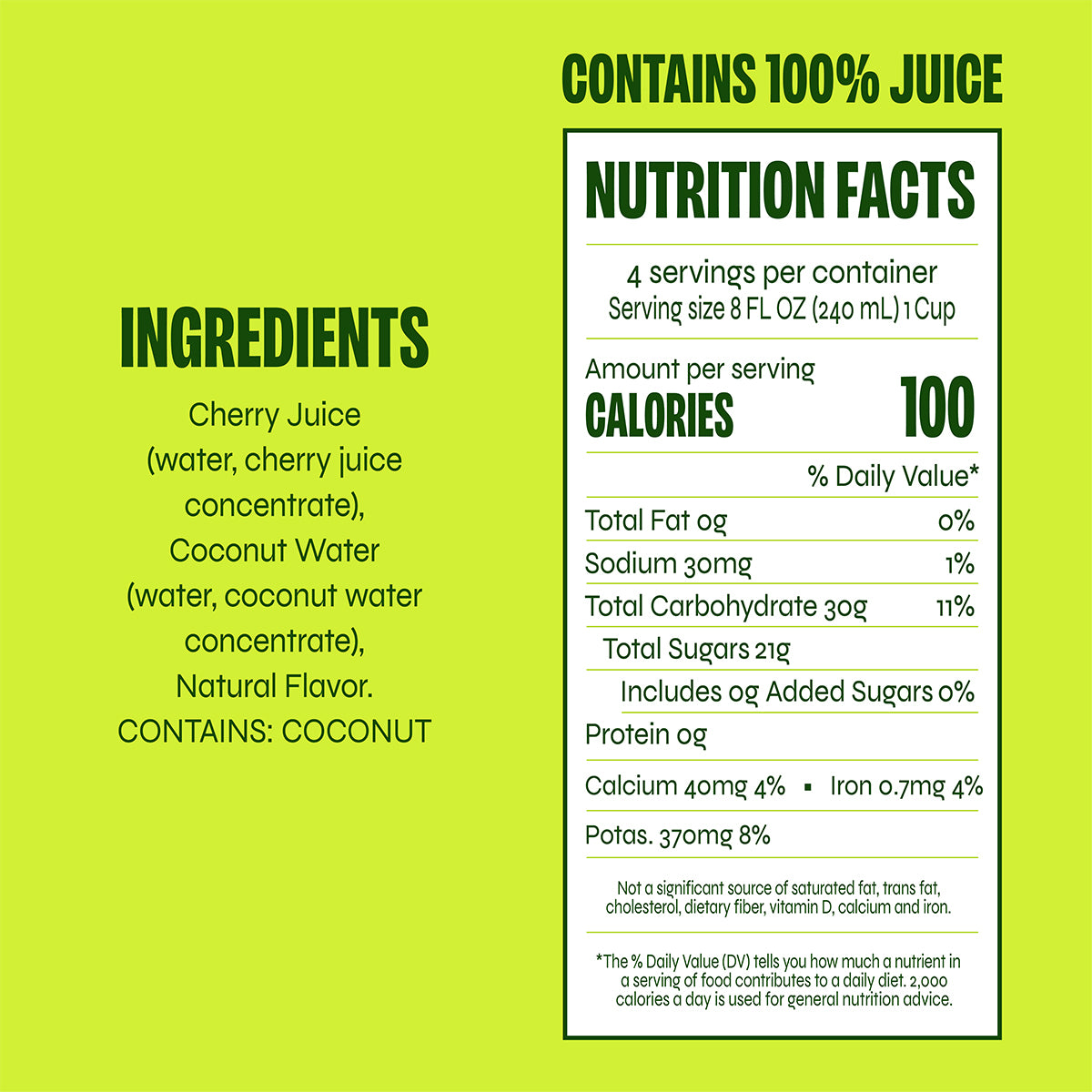 - STRAIGHT UP YUM. 100% juice with a splash of coconut water. Tart Cherry says it all